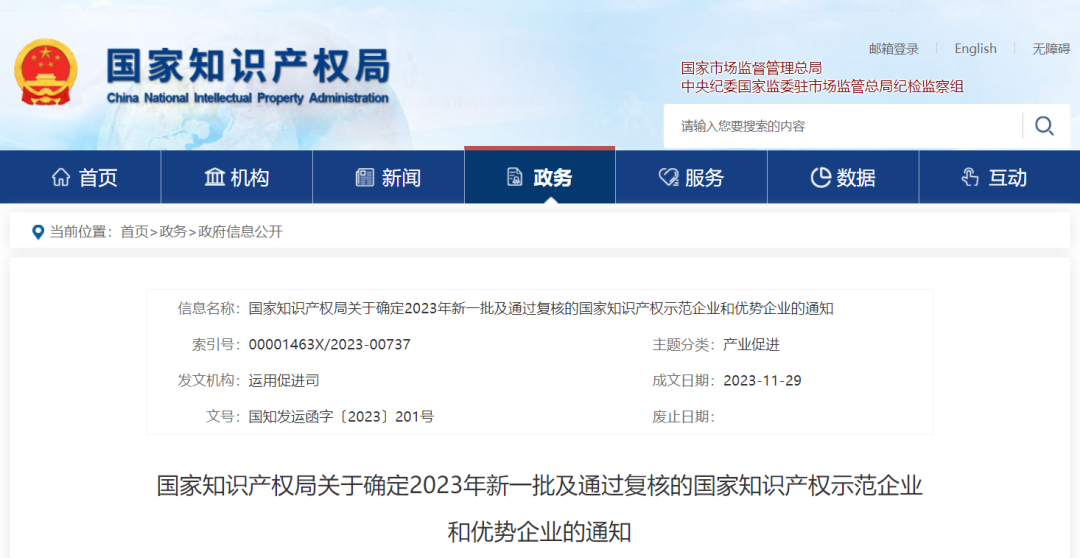 為深入貫徹落實(shí)《知識(shí)產(chǎn)權(quán)強(qiáng)國(guó)建設(shè)綱要(2021—2035年)》和《“十四五”國(guó)家知識(shí)產(chǎn)權(quán)保護(hù)和運(yùn)用規(guī)劃》決策部署,根據(jù)《國(guó)家知識(shí)產(chǎn)權(quán)局辦公室關(guān)于面向企業(yè)開展2023年度知識(shí)產(chǎn)權(quán)強(qiáng)國(guó)建設(shè)示范工作的通知》(國(guó)知辦函運(yùn)字〔2023〕572號(hào))要求,經(jīng)企業(yè)申報(bào)、組織測(cè)評(píng)、地方知識(shí)產(chǎn)權(quán)管理部門推薦,國(guó)家知識(shí)產(chǎn)權(quán)局近日審核確定新一批國(guó)家知識(shí)產(chǎn)權(quán)示范企業(yè)、新一批國(guó)家知識(shí)產(chǎn)權(quán)優(yōu)勢(shì)企業(yè)名單,培育期限為2023年11月至2026年10月。