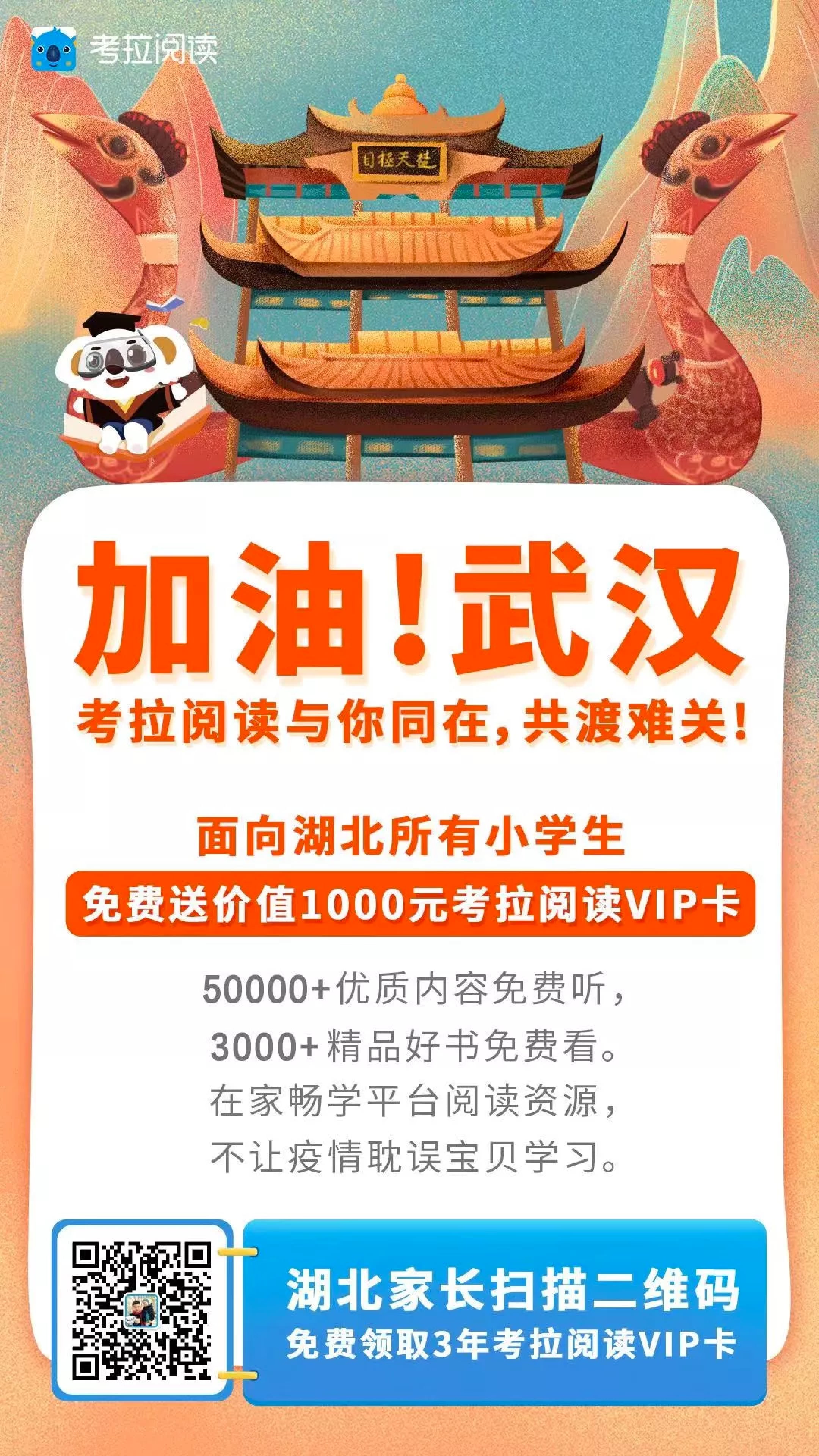 K12分級閱讀APP考拉閱讀向湖北所有小學(xué)生免費(fèi)贈(zèng)送價(jià)值1000元3年考拉閱讀VIP,湖北省家長掃描二維碼即可領(lǐng)取該VIP卡。截止目前,考拉閱讀已向湖北省小學(xué)生捐贈(zèng)了2萬余張VIP卡。
