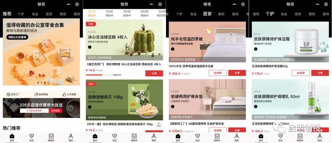 夠貨團隊關(guān)于市場機會的觀點是,更具消費力的女性及三四五線群體的生活消費需求其實并沒有被這種模式覆蓋到,因此夠貨想從定位上做差異化,目前的品類也主打美妝、家居、食品等。