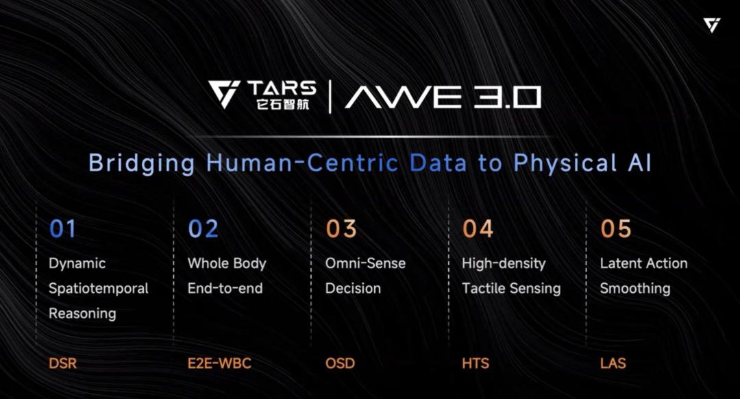 從技術(shù)突破來看,AWE 3.0在延續(xù)全身端到端學(xué)習(xí)、動(dòng)態(tài)時(shí)空推理等既有優(yōu)勢(shì)基礎(chǔ)上,實(shí)現(xiàn)了三項(xiàng)關(guān)鍵性的技術(shù)創(chuàng)新:全視角通感決策(OSD)、高密度觸覺感知(HTS)、隱空間絲滑動(dòng)作(LAS),每一項(xiàng)都直擊當(dāng)前具身智能發(fā)展的核心痛點(diǎn)。