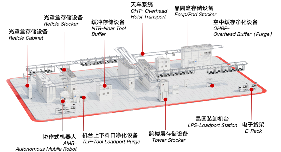 在對(duì)潔凈度、效率、安全要求極為苛刻的晶圓廠內(nèi),天車系統(tǒng)承擔(dān)著極為重要且復(fù)雜的整廠搬運(yùn)任務(wù)。整套AMHS系統(tǒng)由多款軟件和硬件組成。軟件包括物料控制系統(tǒng)、天車調(diào)度軟件等;硬件包括天車、移動(dòng)機(jī)器人、傳送線等搬運(yùn)設(shè)備和潔凈立庫、空中緩存位、工作站等存儲(chǔ)設(shè)備以及樓層間的傳送存儲(chǔ)設(shè)備等。