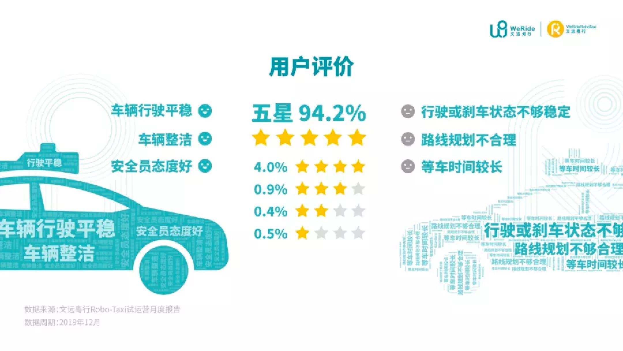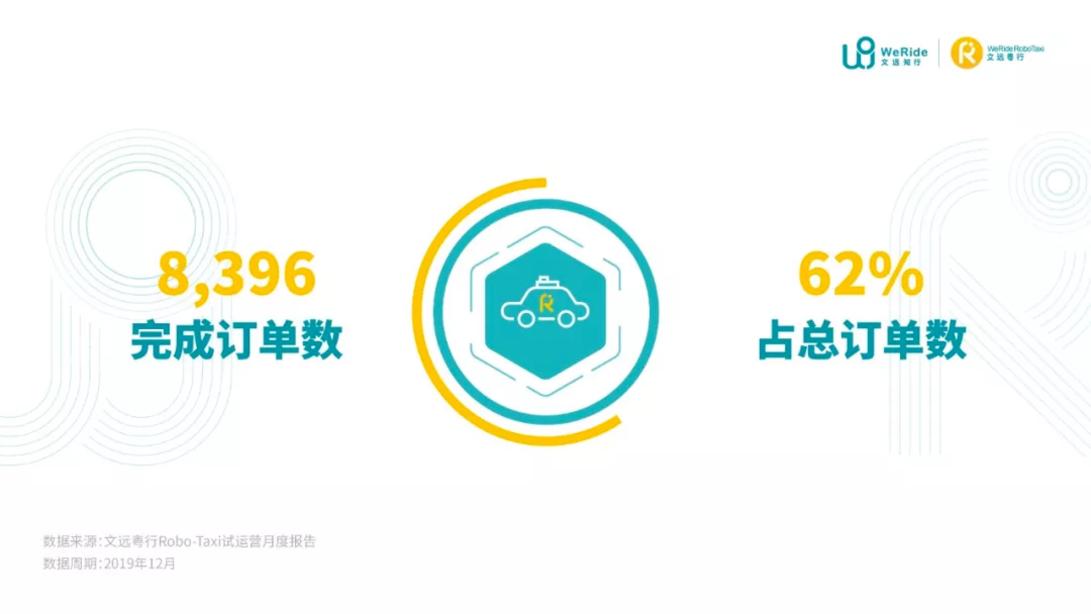 文遠粵行試運營首月,即2019年12月01日至31日,共完成8396個出行訂單,零安全事故,日均出行服務270.8次,單天最多訂單達到438單,服務訂單總里程達41140公里,共服務4683名用戶。