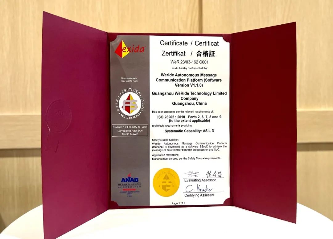 exida為文遠(yuǎn)知行頒發(fā)證書(shū)