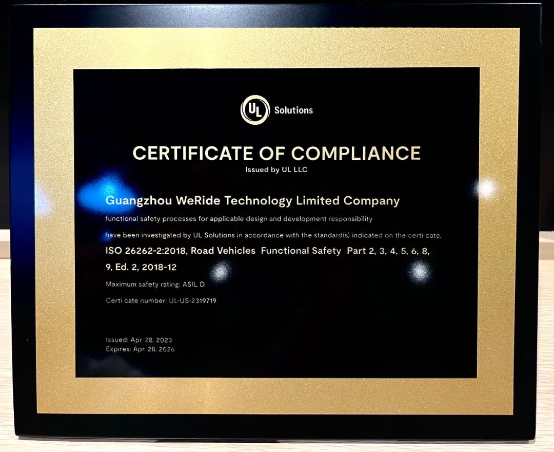 UL Solutions為文遠(yuǎn)知行頒發(fā)證書