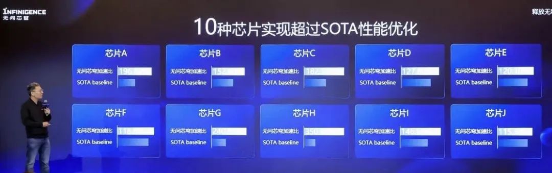 兩年之后,無(wú)問(wèn)芯穹在本次發(fā)布會(huì)上展示了其在10種芯片上的性能優(yōu)化數(shù)據(jù),在每張卡上都顯示已取得了目前行業(yè)內(nèi)最優(yōu)的性能優(yōu)化效果。