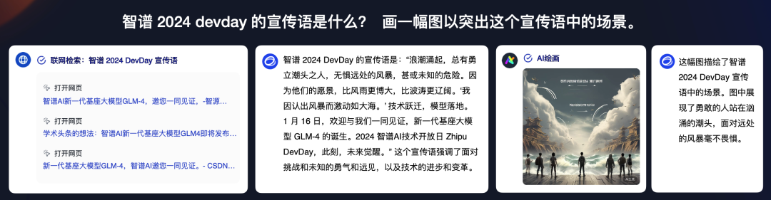 GLM-4實(shí)現(xiàn)自主根據(jù)用戶意圖,自動(dòng)理解、規(guī)劃復(fù)雜指令,自由調(diào)用網(wǎng)頁瀏覽器、Code Interpreter代碼解釋器和多模態(tài)文生圖大模型,以完成復(fù)雜任務(wù)。