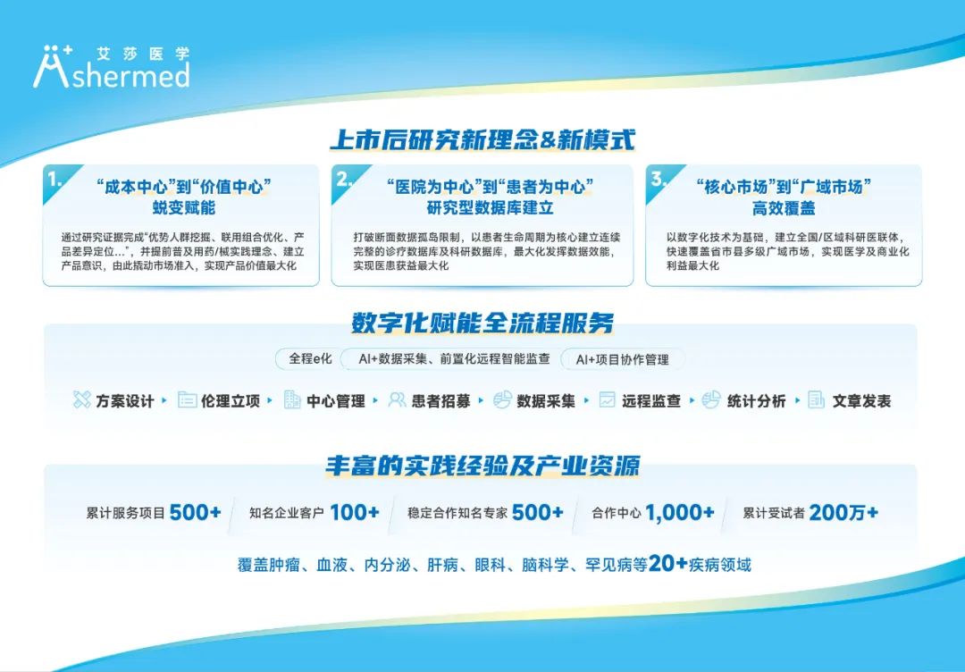 艾莎醫(yī)學(xué)作為一家致力于為國內(nèi)外創(chuàng)新藥械企業(yè)提供上市后臨床研究的一站式專業(yè)服務(wù)公司,正通過互聯(lián)網(wǎng)+數(shù)智化技術(shù)重塑臨床研究運營管理流程,推廣創(chuàng)新運營管理模式,以更高效地賦能和加速推動中國創(chuàng)新藥械產(chǎn)品的研發(fā)過程。經(jīng)過10年的發(fā)展,艾莎醫(yī)學(xué)已經(jīng)成為真實世界研究領(lǐng)域的佼佼者。