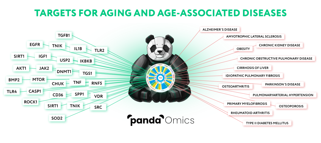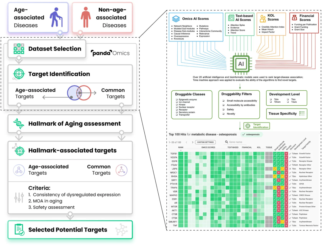 現(xiàn)在,英矽智能的研究團隊使用由AI驅動的PandaOmics?平臺,對多個靶點進行識別并按照相關性排序,提出了一系列有潛力開展藥物發(fā)現(xiàn)的新型抗衰老靶點。除此之外,該團隊還提交了一份經(jīng)典靶點列表,其將有希望在衰老疾病中開展藥物再利用研究。