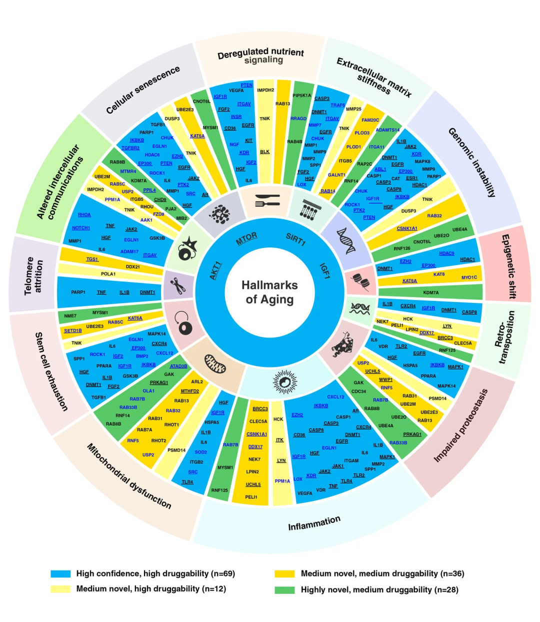 經(jīng)評估,當前共有145個基因被認為是潛在的衰老相關靶點,并被映射到相應的衰老列表中。其中包括69個具有高可信度的靶點,48個具有高或中等成藥性的新靶點,以及28個具有中等成藥性的高度新穎靶點。