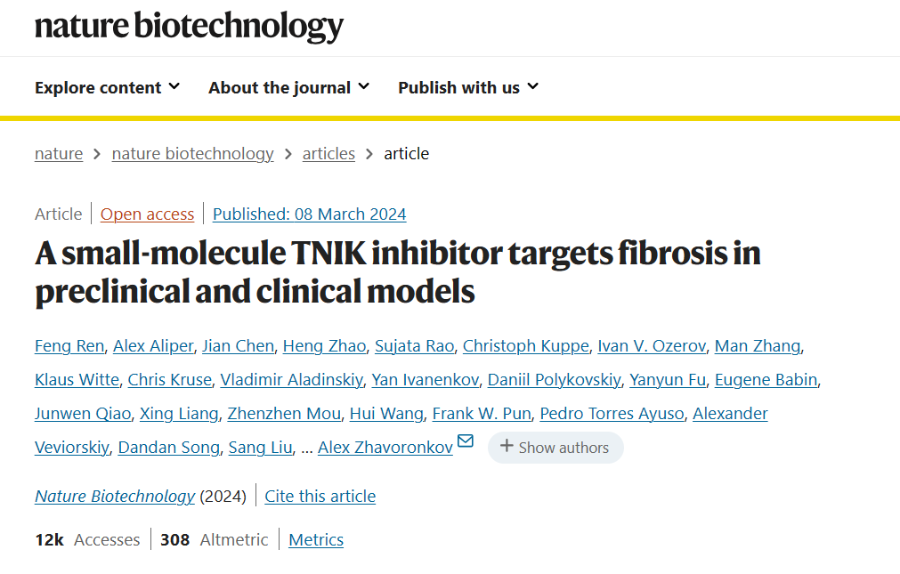 在隨后的臨床前研究中,INS018_055在體內(nèi)和體外試驗(yàn)中均顯示出對IPF的顯著療效,并在多個(gè)細(xì)胞系和多個(gè)物種的藥代動(dòng)力學(xué)和安全性研究中顯示出良好的結(jié)果。此外,INS018_055還表現(xiàn)出泛纖維化抑制功能,在另外兩種動(dòng)物模型中減輕了皮膚和腎臟纖維化?;谶@些研究,INS018_055于2021年2月被提名為臨床前候選化合物。此時(shí)距離TNIK被PandaOmics提名為潛在IPF治療靶點(diǎn),僅僅過去了18個(gè)月。