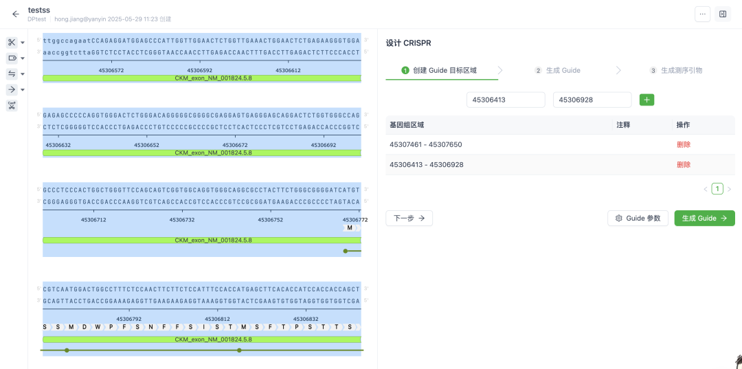 作為衍因智研云平臺分子生物學模塊的重磅升級,新推出的“CRISPR工具”集成了篆碼生物在基因編輯酶領域的深厚積累與衍因科技強大的云端科研協(xié)作能力,為研究人員提供了一站式的CRISPR-Cas9系統(tǒng)gRNA(向導RNA)設計與分析解決方案,顯著提高基因編輯實驗的成功率和效率。