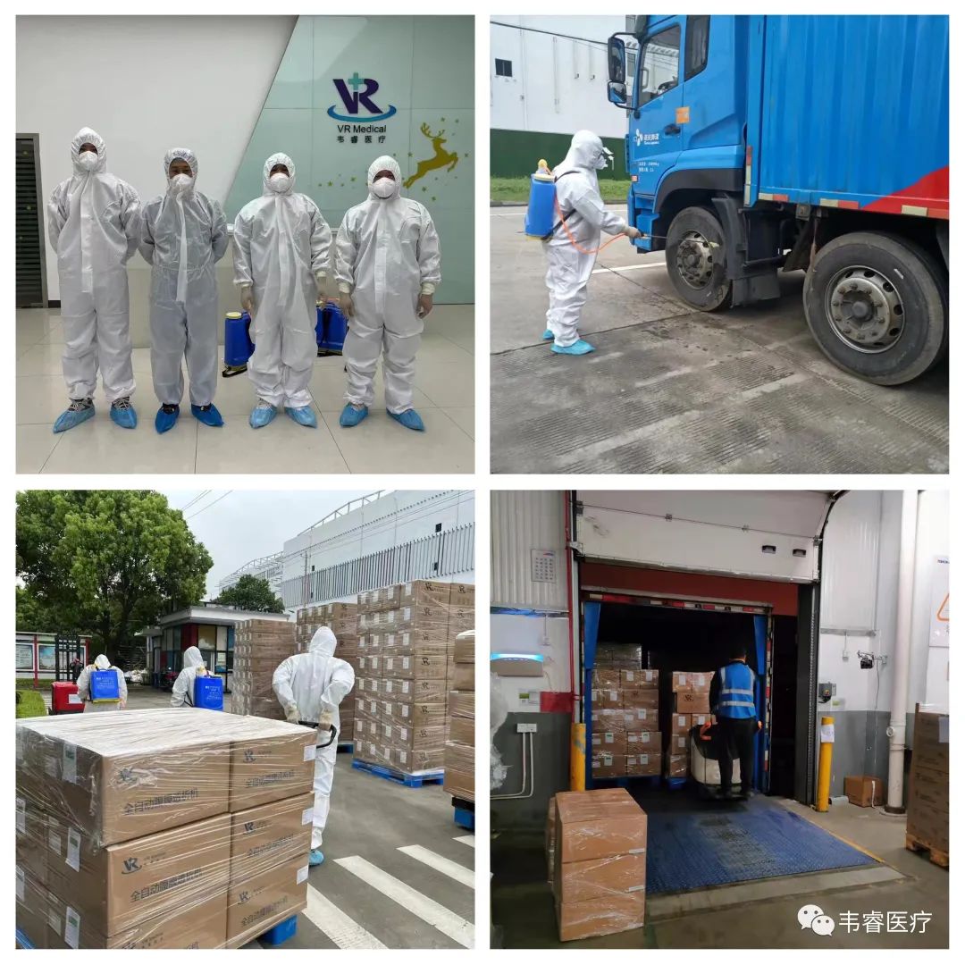 為了實(shí)現(xiàn)防疫要求,韋睿醫(yī)療決定在一個(gè)小時(shí)內(nèi)完成轉(zhuǎn)倉(cāng)、消殺和裝載等全部工作。為確保整個(gè)運(yùn)輸過(guò)程在安全、有序、高效中進(jìn)行,韋睿醫(yī)療各部門(mén)爭(zhēng)分奪秒,連夜制定“車(chē)輛入周裝貨的閉環(huán)管理方案”,既有條不紊地做好產(chǎn)品質(zhì)控和出貨安排,又嚴(yán)格做好個(gè)人防護(hù)和環(huán)境消殺等防疫準(zhǔn)備。