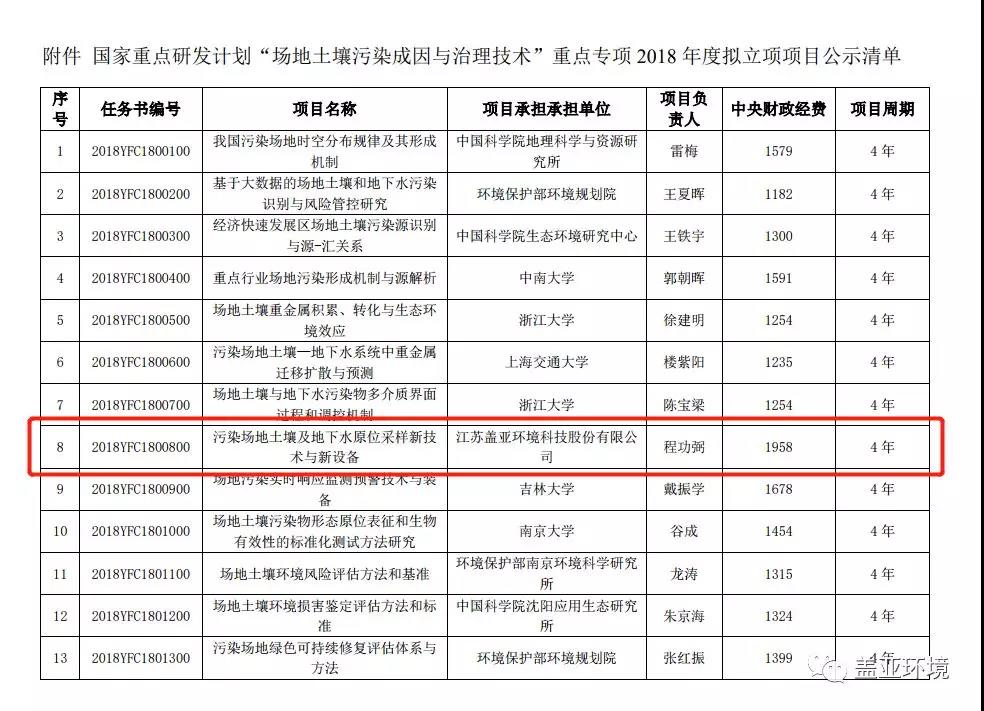 蓋亞環(huán)境作為牽頭單位,聯(lián)合9家企事業(yè)單位,一舉拿下“2.1污染場地土壤及地下水原位采樣新技術與新設備”重點專項,中央財政經(jīng)費1958萬元,項目周期4年。