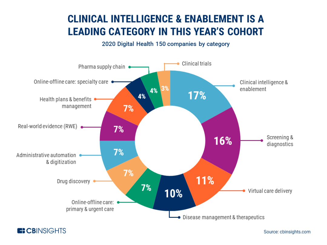 數(shù)字醫(yī)療 150 2020 上榜企業(yè)領(lǐng)域分布(數(shù)據(jù)來源:CB Insights)