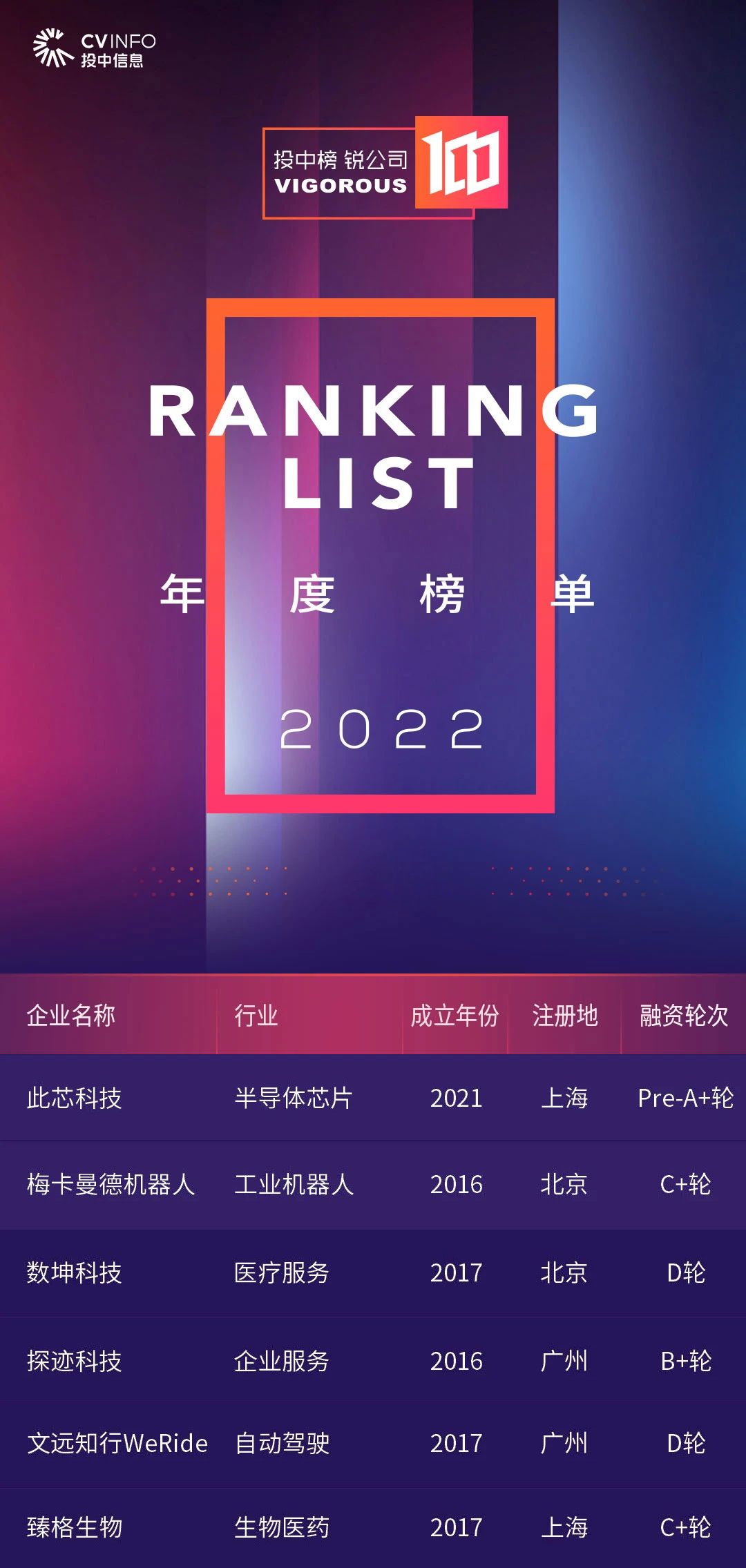 啟明創(chuàng)投投資企業(yè)此芯科技、梅卡曼德機器人、數(shù)坤科技、探跡科技、文遠知行、臻格生物榮登榜單。