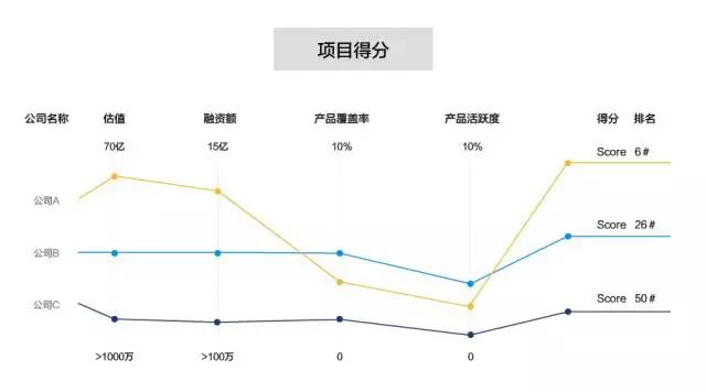 在這個(gè)簡(jiǎn)化模型中,我們展示了知識(shí)新經(jīng)濟(jì)賽道中的三個(gè)投資項(xiàng)目(項(xiàng)目A/B/C)在不同的維度中獲得分?jǐn)?shù),最后加總獲得項(xiàng)目的總分。