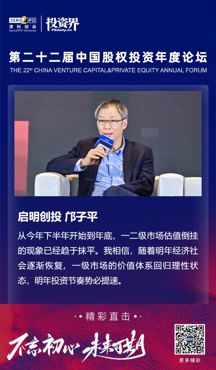 鄺子平進(jìn)一步表示:“從今年下半年開始到年底,一二級(jí)市場(chǎng)估值倒掛的現(xiàn)象已經(jīng)趨于抹平。我相信,隨著明年經(jīng)濟(jì)社會(huì)逐漸恢復(fù),一級(jí)市場(chǎng)的價(jià)值體系回歸理性狀態(tài),明年投資節(jié)奏勢(shì)必提速?!?/strong>