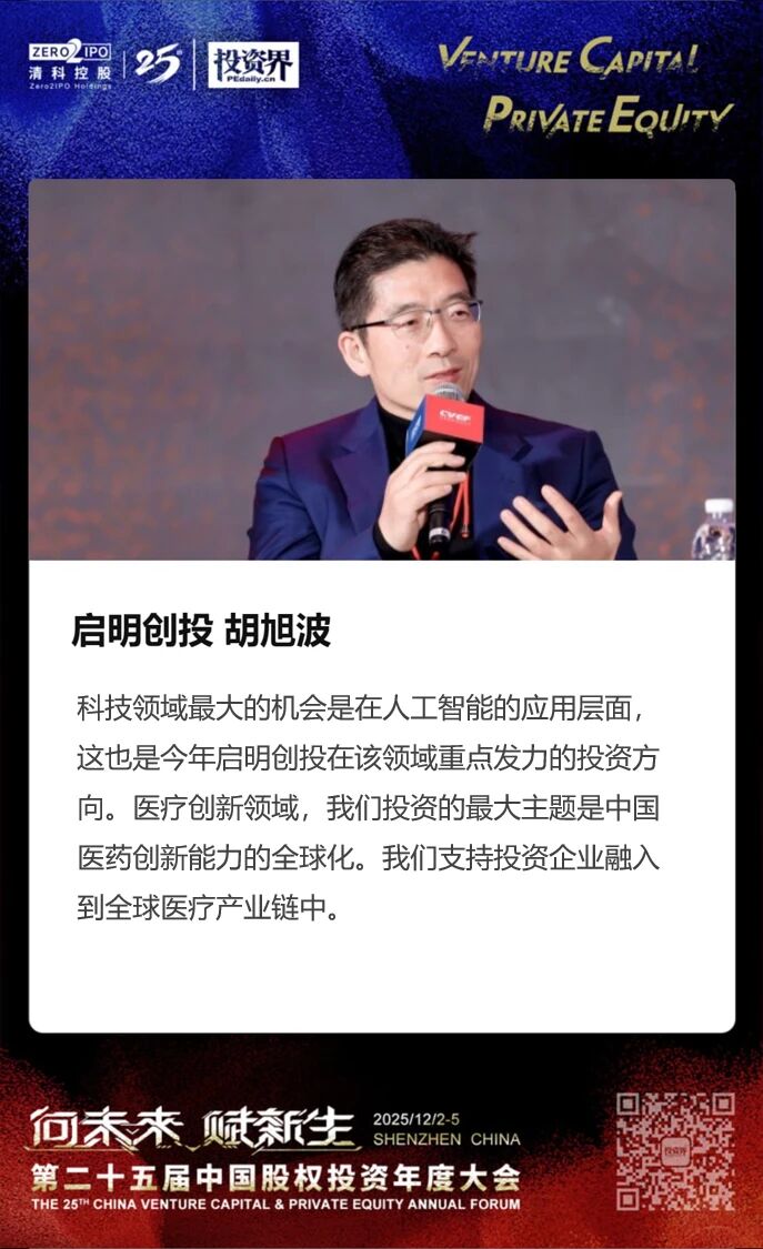 在第二十五屆中國股權(quán)投資年度論壇上,胡旭波指出,啟明創(chuàng)投的投資聚焦兩大核心領(lǐng)域:科技與醫(yī)療創(chuàng)新。在科技領(lǐng)域,人工智能應(yīng)用層是最大的機會所在,也是啟明創(chuàng)投今年在該領(lǐng)域的重點發(fā)力的投資方向。醫(yī)療創(chuàng)新領(lǐng)域的投資則圍繞中國醫(yī)藥創(chuàng)新能力的全球化這一核心主題展開,覆蓋創(chuàng)新藥、醫(yī)療器械等。啟明創(chuàng)投持續(xù)支持投資企業(yè)融入全球醫(yī)療產(chǎn)業(yè)鏈。