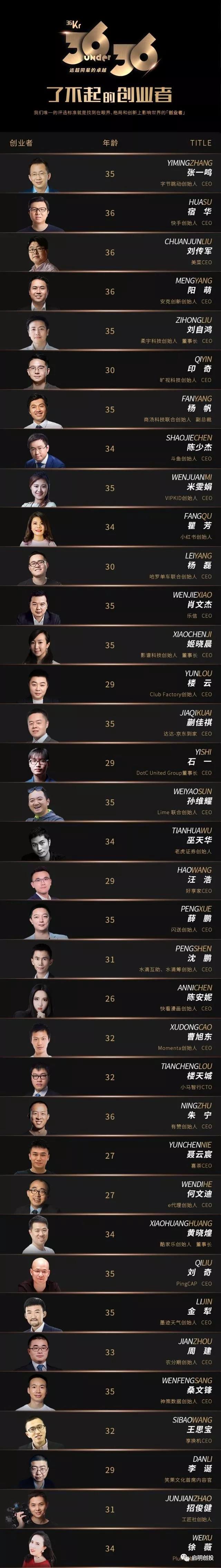 同時(shí),今日頭條創(chuàng)始人兼CEO張一鳴、曠視科技創(chuàng)始人兼CEO印奇和Plum創(chuàng)始人兼CEO徐薇獲評(píng)“36位36歲以下了不起的創(chuàng)業(yè)者”。