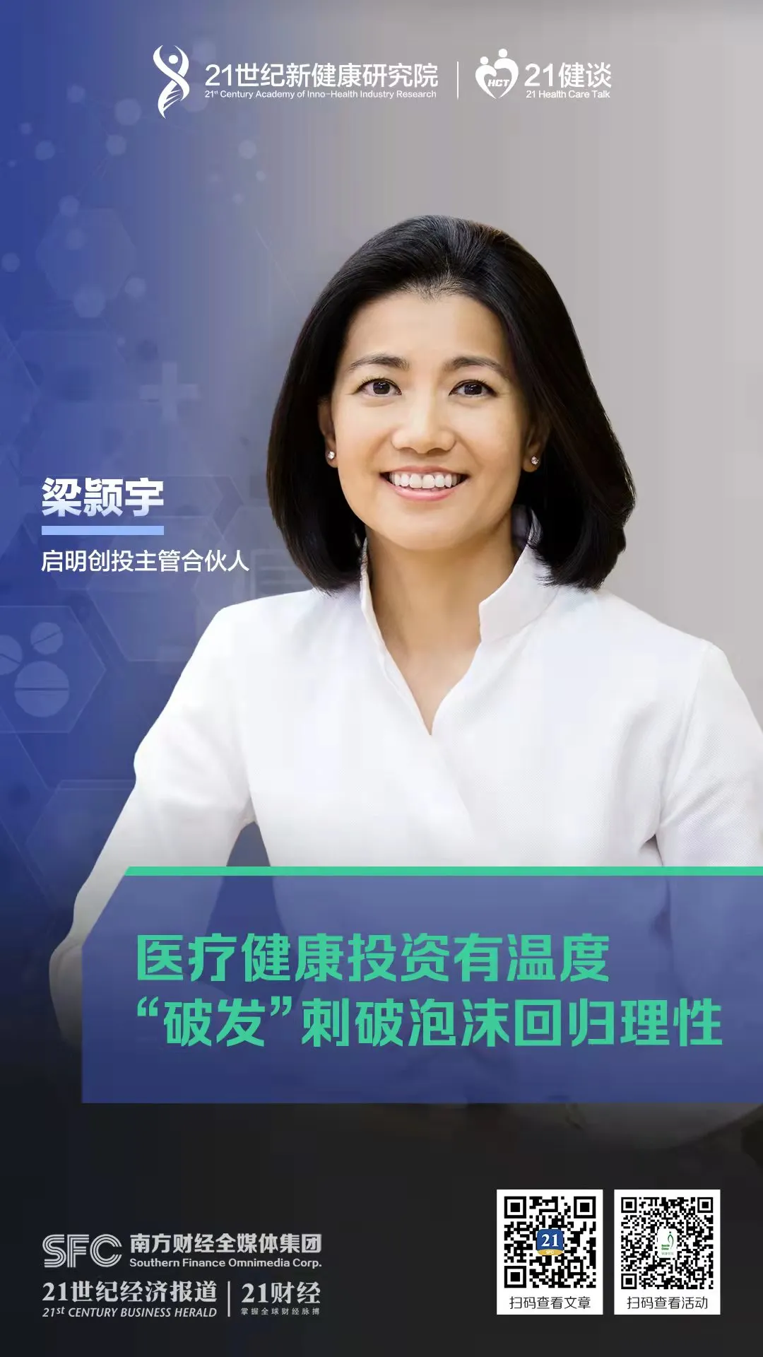 面對(duì)醫(yī)療健康賽道爆紅,備受資本追捧的現(xiàn)狀,歷經(jīng)過(guò)2000年互聯(lián)網(wǎng)行業(yè)泡沫投資的梁颕宇強(qiáng)調(diào),醫(yī)療健康行業(yè)也會(huì)有泡沫,實(shí)際上一些新股的破發(fā)就是對(duì)市場(chǎng)的教育,資本投資需要回歸到理性角度。