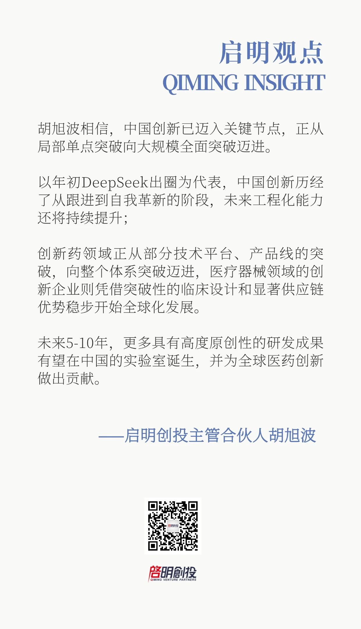 編者按:2025年年終,啟明創(chuàng)投主管合伙人胡旭波在接受投資界采訪時(shí),復(fù)盤了2025年創(chuàng)新藥板塊崛起的行業(yè)脈絡(luò),拆解了啟明創(chuàng)投逆勢(shì)投資醫(yī)療創(chuàng)新領(lǐng)域的決策邏輯。談及中國(guó)醫(yī)療創(chuàng)新最關(guān)鍵的跨越,他強(qiáng)調(diào)行業(yè)正從局部單點(diǎn)突破向大規(guī)模全面突破邁進(jìn):一方面以工程化能力加速創(chuàng)新落地,另一方面憑源頭創(chuàng)新角逐全球市場(chǎng)。展望未來(lái),胡旭波表示,license-out的爆發(fā)只是開(kāi)端,具備全球競(jìng)爭(zhēng)力的原創(chuàng)成果將持續(xù)涌現(xiàn),而構(gòu)建健康的產(chǎn)業(yè)生態(tài),需要資本、企業(yè)與國(guó)際市場(chǎng)的深度協(xié)同。