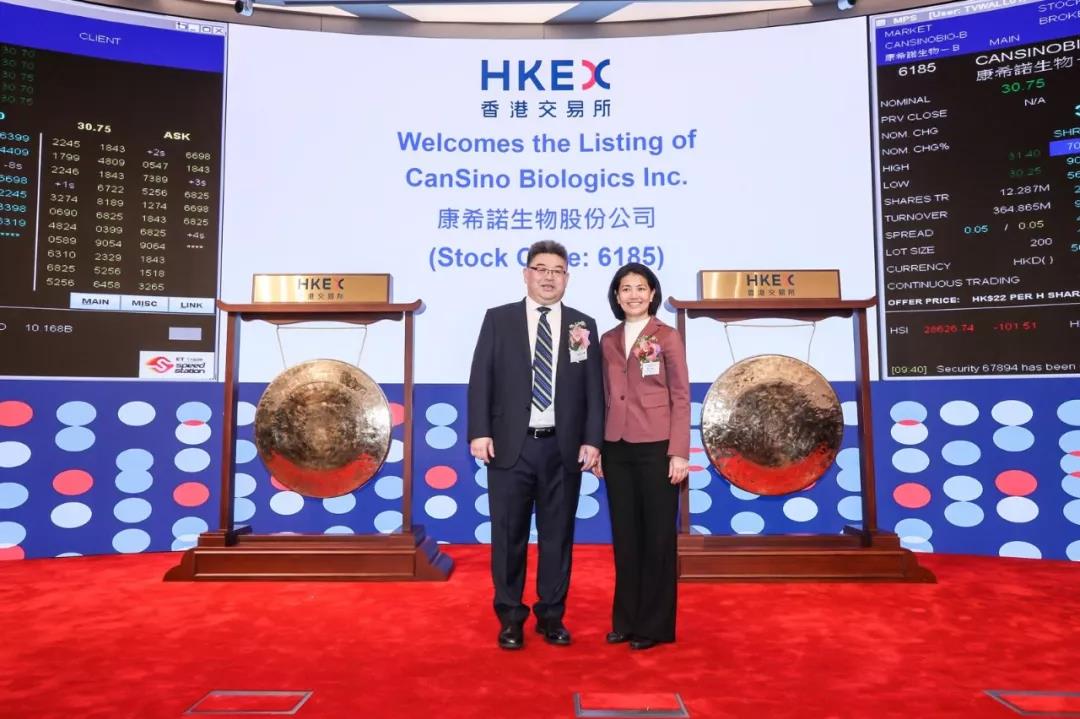 啟明創(chuàng)投主管合伙人梁颕宇與康希諾生物董事會(huì)主席兼聯(lián)合創(chuàng)始人宇學(xué)峰博士在上市現(xiàn)場
