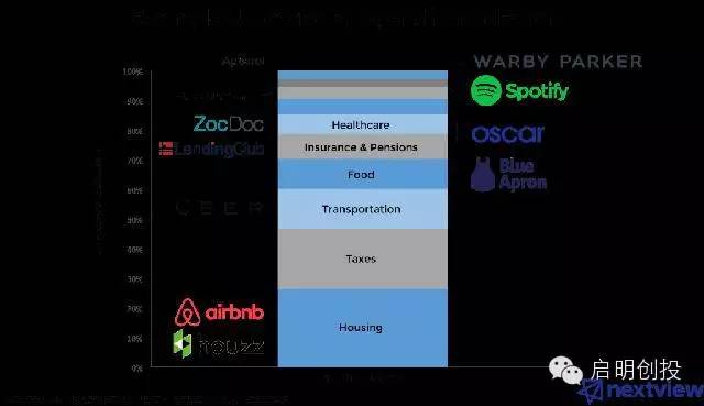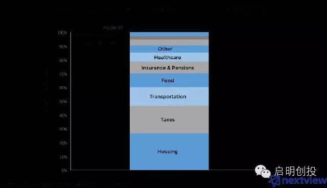 遵循這個(gè)邏輯我們就不難發(fā)現(xiàn),Uber、Airbnb這兩個(gè)全球最具價(jià)值的創(chuàng)企都屬于消費(fèi)大類:行和住。當(dāng)然,它們只是眾多公司的兩個(gè)代表而已。 下圖是消費(fèi)者支出最多的幾大類: