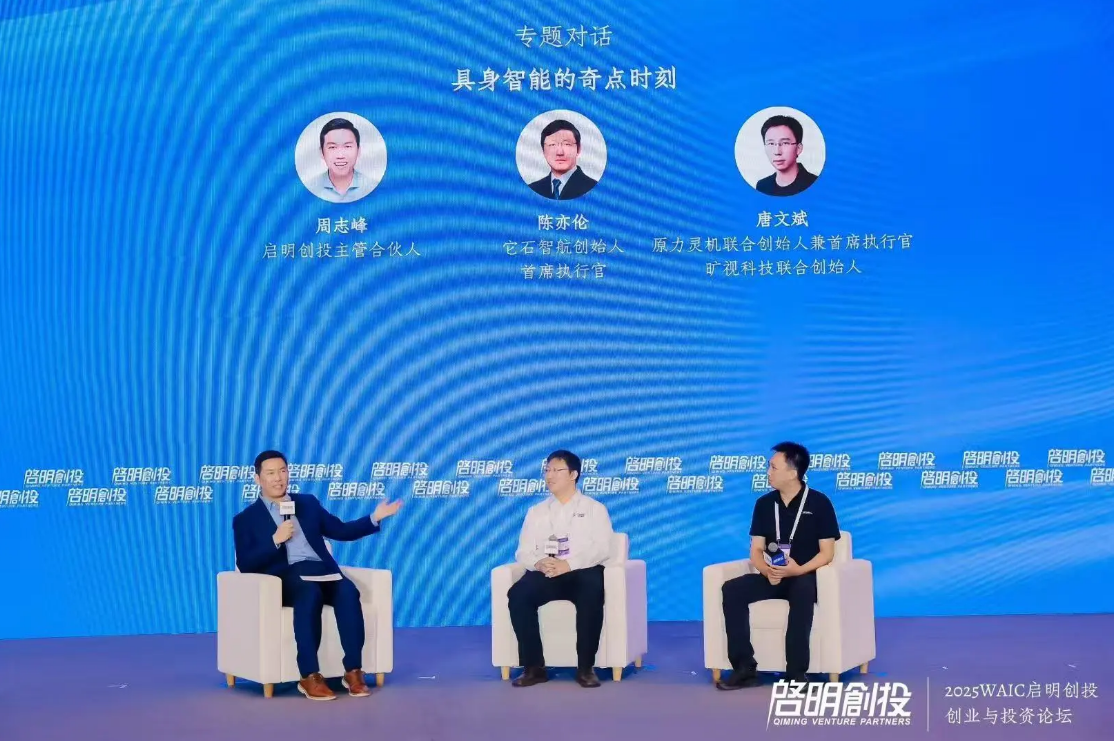 在對話環(huán)節(jié)中,啟明創(chuàng)投主管合伙人周志峰擔任主持人,與它石智航創(chuàng)始人兼首席執(zhí)行官陳亦倫,以及原力靈機聯(lián)合創(chuàng)始人兼首席執(zhí)行官、曠視科技聯(lián)合創(chuàng)始人唐文斌圍繞“具身智能的奇點時刻”展開討論。
