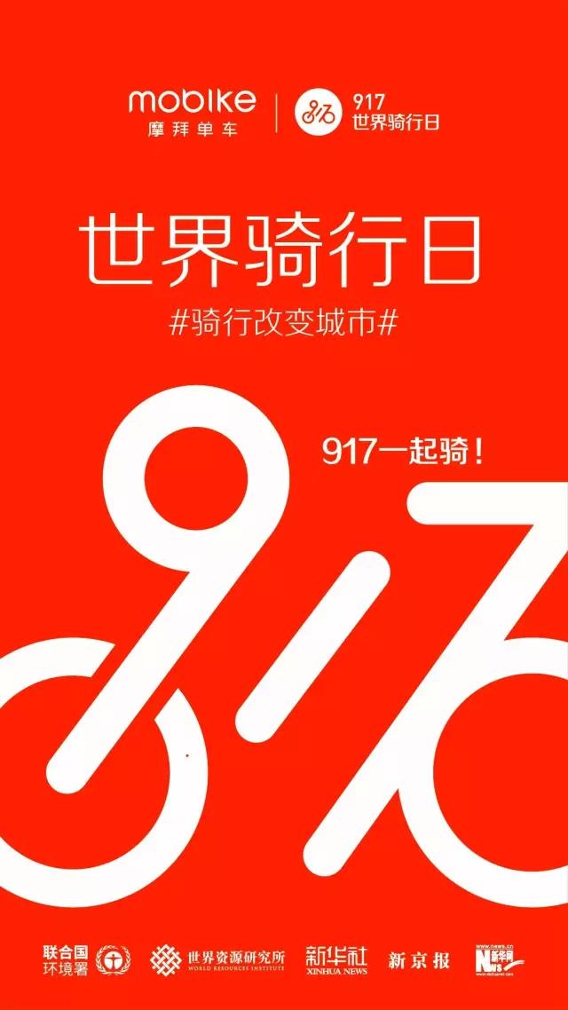 8月29日,全球智能共享單車(chē)首創(chuàng)者與領(lǐng)導(dǎo)者摩拜單車(chē)攜手首批聯(lián)合發(fā)起機(jī)構(gòu)——聯(lián)合國(guó)環(huán)境署、世界資源研究所等全球性國(guó)際組織,以及新華社、新京報(bào)等國(guó)內(nèi)權(quán)威媒體,共同發(fā)起“917世界騎行日”,倡導(dǎo)“騎行改變城市”理念。這也是全球首個(gè)騎行文化節(jié)日。
