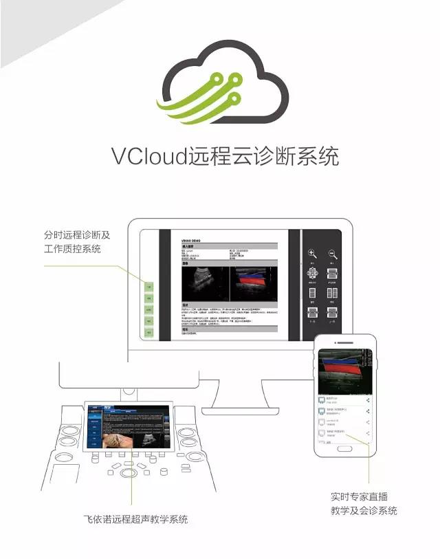 飛依諾秉持超越用戶期望的創(chuàng)新理念,同時為用戶提供高附加值的VCloud遠程云診斷系統(tǒng)。其中包含 飛依諾遠程教學(xué)系統(tǒng):機器內(nèi)置教學(xué)系統(tǒng),統(tǒng)一流程掃查,適于建立規(guī)范及開展繼續(xù)教育。實時專家直播教學(xué)及會診系統(tǒng):在飛依諾機器上,超聲專家可以進行針對性的超聲掃查診斷直播教學(xué),其他醫(yī)生通過手機APP就可以遠程觀看整個直播并可以進行語音和文字互動。分時遠程診斷及工作質(zhì)控系統(tǒng):通過電腦端或手機APP可實現(xiàn)遠程專家實時會診,語音、文字指導(dǎo)實時檢查以及圖像診斷、測量、出報告。