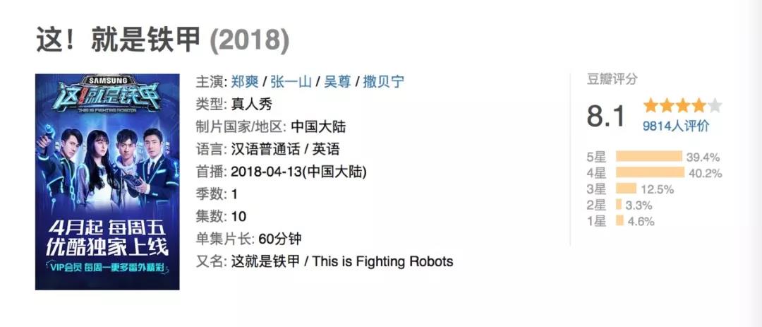 年初,創(chuàng)客星球就聯(lián)合浙江衛(wèi)視打造過《鐵甲雄心》,豆瓣評分8.2,同樣品質(zhì)上乘。兩相對比,《這就是鐵甲》引入“明星經(jīng)理人”元素,在娛樂化的包裝和年輕態(tài)的表達上,作出了更貼合網(wǎng)綜屬性的升級。