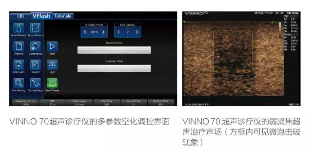 VINNO70 超聲診療一體機(jī)在常規(guī)超聲診斷的基礎(chǔ)上,增加了V Flash超聲空化功能,多參數(shù)可調(diào)滿足了微氣泡諧振、膨脹、內(nèi)爆等的控制