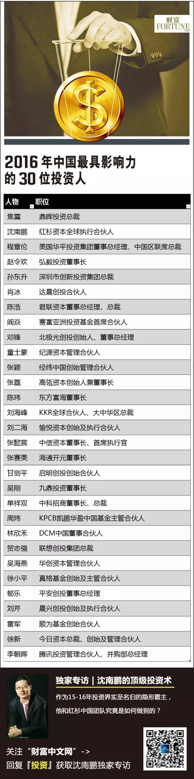 2016年《財(cái)富》(中文版)與清科集團(tuán)再次合作進(jìn)行“中國(guó)最具影響力的30位投資人”評(píng)選,清科集團(tuán)為此次榜單提供了數(shù)據(jù)支持。根據(jù)候選人機(jī)構(gòu)類別、管理資金、投資人所投資的企業(yè)數(shù)量、規(guī)模、企業(yè)退出回報(bào)、被投企業(yè)上市市值,結(jié)合投資人市場(chǎng)影響力等綜合評(píng)選標(biāo)準(zhǔn),《財(cái)富》(中文版)最終評(píng)選出2015年以來(lái),中國(guó)VC/PE市場(chǎng)最具影響力的30位投資人,并點(diǎn)評(píng)他們對(duì)市場(chǎng)趨勢(shì)的把握和前瞻。