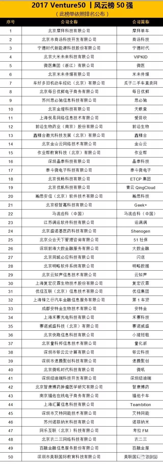 其中啟明創(chuàng)投投資的5家企業(yè):摩拜單車(chē)、微醫(yī)、云知聲、北京盛諾基醫(yī)藥、賽諾威盛榮登2017 Venture50|風(fēng)云榜 50強(qiáng)。