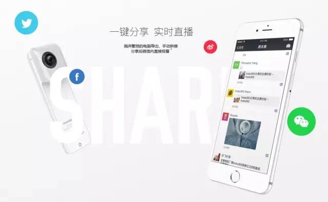 Nano相機(jī)機(jī)身重量?jī)H為70g,前后置兩個(gè)超廣角魚眼鏡頭,實(shí)時(shí)拍攝、拼接3K(3040×1520)全景照片或視頻??芍苯硬逶趇Phone上,通過蘋果閃電接口連接手機(jī)app,實(shí)時(shí)預(yù)覽并一鍵分享到微信、朋友圈、微博、Facebook、Twitter等社交平臺(tái)。