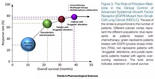 從最初的不篩選患者使用化療方案治療,到根據(jù)臨床特征選擇患者進(jìn)行靶向治療,再到根據(jù)“可治療”基因狀態(tài)篩選患者有針對性選擇靶向甚至是多方案聯(lián)合治療,雖然縮小了治療適應(yīng)人群,但是針對特定人群不管是藥物反應(yīng)率(Response Rate)還是總生存期(Overall Survival)都有顯著提高(圖3)