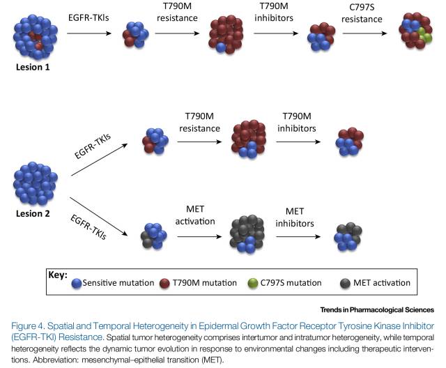 研究顯示,腫瘤的時(shí)間及空間異質(zhì)性在EGFR-TKIs耐藥機(jī)制中的作用極其重要。不同的耐藥機(jī)制可以表現(xiàn)為治療前已經(jīng)存在的突變克隆或者長期治療過程中逐漸凸顯的突變克隆,即時(shí)間異質(zhì)性;也可以表現(xiàn)在同一患者不同病灶中,即空間異質(zhì)性(圖4)。