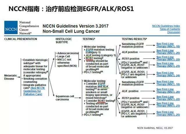近期,美國癌癥聯(lián)盟(NCCN)發(fā)布了2017版NSCLC臨床實(shí)踐指南,新版NCCN指南在晚期NSCLC治療流程及一線治療進(jìn)展后的處理上都體現(xiàn)出靶向診療在NSCLC上的新進(jìn)展。
