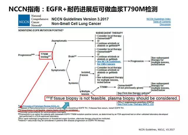一代EGFR-TKIs一線治療后繼發(fā)耐藥機(jī)制中,T790M突變約占50%,第三代EGFR-TKIs問世標(biāo)志著EGFR T790M突變的NSCLC繼發(fā)耐藥患者的后續(xù)治療有了突破性進(jìn)展。2015年11月FDA加速批準(zhǔn)了Osimertinib(AZD9291)用于治療EGFR T790M突變的、在EGFR TKI治療時(shí)或治療后進(jìn)展的轉(zhuǎn)移性NSCLC。因此,2017版NCCN指南推薦EGFR-TKIs一線治療進(jìn)展后應(yīng)檢測T790M突變,且當(dāng)組織活檢標(biāo)本不可獲取時(shí)可考慮選用血漿標(biāo)本進(jìn)行檢測(圖7)。
