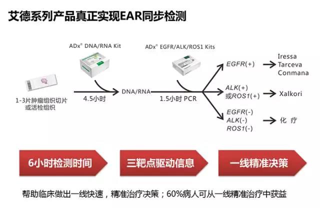 今年1月,艾德生物自主研發(fā)的EGFR/ALK/ROS1基因突變聯(lián)合檢測試劑盒獲得CFDA《醫(yī)療器械注冊證》,是國內(nèi)唯一獲批可同時(shí)檢測EGFR、ALK、ROS1三基因的試劑產(chǎn)品?;趶V泛應(yīng)用的PCR平臺(tái)及升級的檢測技術(shù),該試劑盒操作更加簡便、快捷,且適用新鮮組織及活檢、細(xì)胞學(xué)等小標(biāo)本。配套艾德生物DNA/RNA共提取試劑產(chǎn)品,當(dāng)天即可完成從核酸提取、上機(jī)檢測到出具報(bào)告的全部流程,大大縮短臨床診療等待時(shí)間,為NSCLC臨床診療真正實(shí)現(xiàn)EGFR/ALK/ROS1三基因同步檢測。