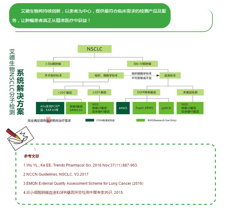 基于ADx-ARMS?技術(shù),艾德生物研發(fā)的EGFR基因突變檢測試劑盒是目前國內(nèi)唯一一個(gè)獲CFDA批準(zhǔn)可用于臨床血液EGFR檢測的ARMS法檢測試劑盒。配套艾德專用常溫采血管及循環(huán)DNA提取試劑盒(4mL血漿上樣),完全符合專家共識(shí)建議,為臨床提供血液EGFR檢測標(biāo)準(zhǔn)化解決方案。