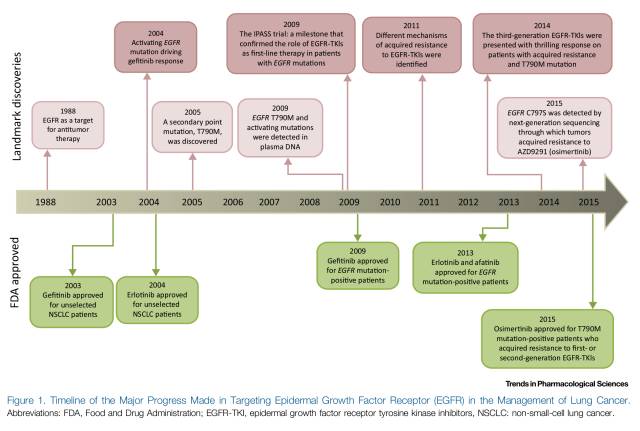 2003年,首個(gè)EGFR酪氨酸激酶抑制劑(EGFR-TKI)——吉非替尼獲美國食品藥品監(jiān)督管理局(FDA)批準(zhǔn),隨后卻因后續(xù)數(shù)據(jù)顯示無法延長患者生存而撤回;2009年,IPASS研究首次揭示了EGFR-TKIs作為一線治療與EGFR基因突變患者的相關(guān)性,隨后的研究也僅針對EGFR突變并證實(shí)在這類晚期NSCLC患者中,EGFR-TKIs療效優(yōu)于一線化療(圖1)。基于這些結(jié)果,吉非替尼、厄洛替尼也獲批用于EGFR突變NSCLC的一線治療。如今EGFR突變檢測已成為全球大多數(shù)腫瘤中心的臨床常規(guī)檢測。此后針對一代EGFR-TKIs治療后耐藥的二代、三代EGFR-TKIs也被設(shè)計(jì)以針對繼發(fā)耐藥的分子機(jī)制為主,以EGFR T790M突變最為常見,并在不同的突變位點(diǎn)人群中表現(xiàn)出不同的治療活性(圖2)。