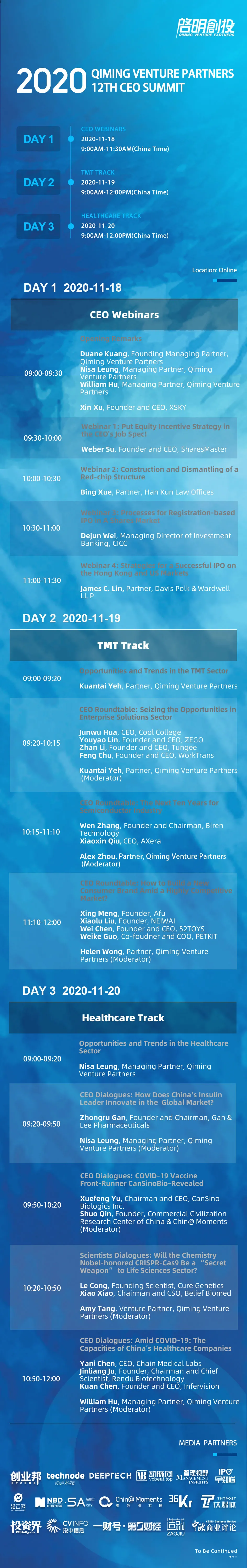 Qiming welcomes the audience from the globe to join our 2020 virtual summit on 18th-20th November 2020. The conference can be accessed via desktop and mobile devices. Simultaneous interpretation will be available.